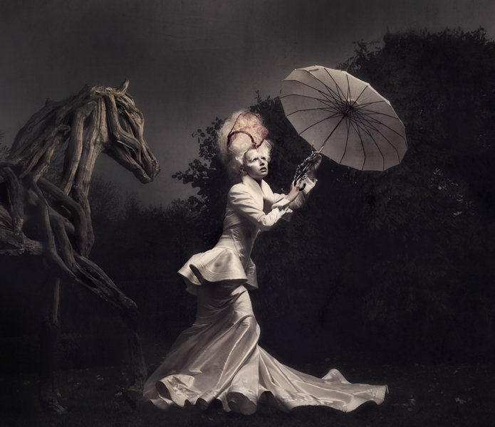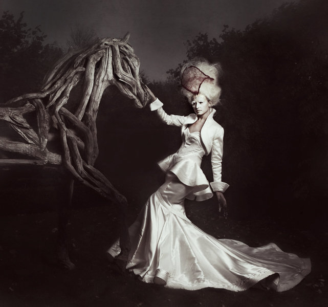 Le cheval en bois flotté de l’artiste Heather Jansch ne semble pas vouloir rester de marbre face à l’élégance de Meg O’Kelly. Malgré sa grâce et son apparence fragile, le cheval pèse trois quarts de tonne. La carcasse est en acier recouverte de fibre de verre.