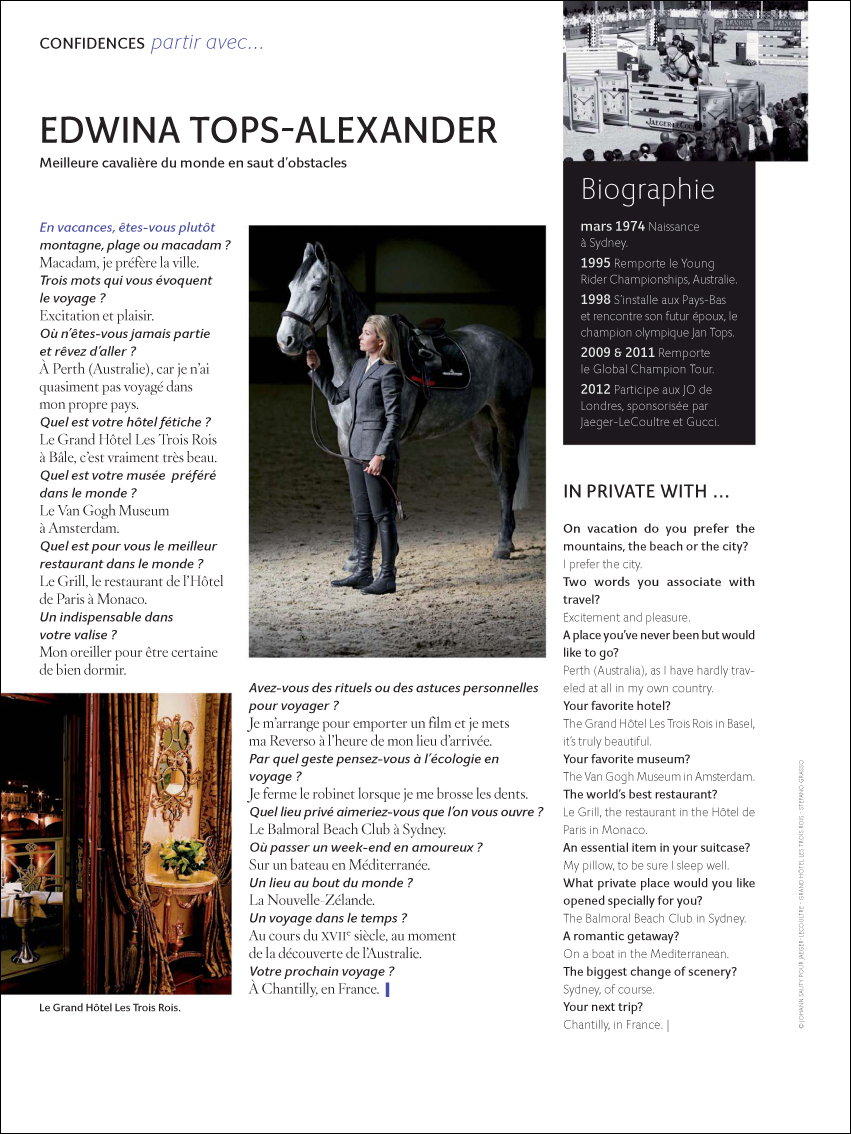 Air France Magazine November 2012 #187: Edwina Tops-Alexander \ by Aurélie Air France Magazine #187, Confidences Patir avec… Edwina Tops-Alexander / IN PRIVATE WITH … November 2012 Posted in: Editorial \ Tagged: @MaskedHorse, Air France Magazine, Caballo, Caballos, Cavalière, Cavalli, Cavallo, Cheval, Chevaux, Editorial, Edwina Tops-Alexander, Equestre, Equestrian, Équitation, Horse, Horses, Jaeger-LeCoultre, Jumping, La Cavalière masquée, Masked Horse, Pferd, Poney, Pony